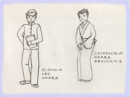 セキネ先生が京都に行くことになった。京都では大きなごふく屋さんでしゅぎょ〜するのだそうだ。先生はホントはだいがくいんに行きたかったんだけど、あととり(跡継)にならなきゃいけないらしい。来週からは セキネ先生の妹でレイ子先生が、勉強をみてくれることになった。女の先生だから楽しみだ。