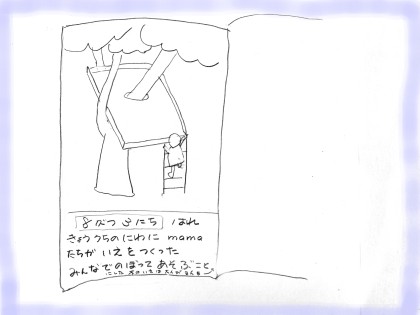 今年の夏休み 友だちはだいたい万博に行くらしい。 だけどPapaとMamは でぶしょ〜なんだそうだ。絵日記をかかなきゃいけないからと うったえたら Mamがツリーハウスを作る作戦だと教えてくれた。次の日Mamは とうりょうやすねやさんたちと皆で庭の木の上に大きな家を作ってくれた。大人が3人も登れるくらいすごい家だ。 明日が楽しみだと思って寝たら、次の日こわすことになった。おばあちゃんの柿の木に作ったのがマズかったらしい。